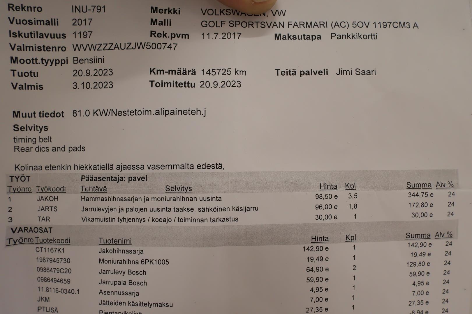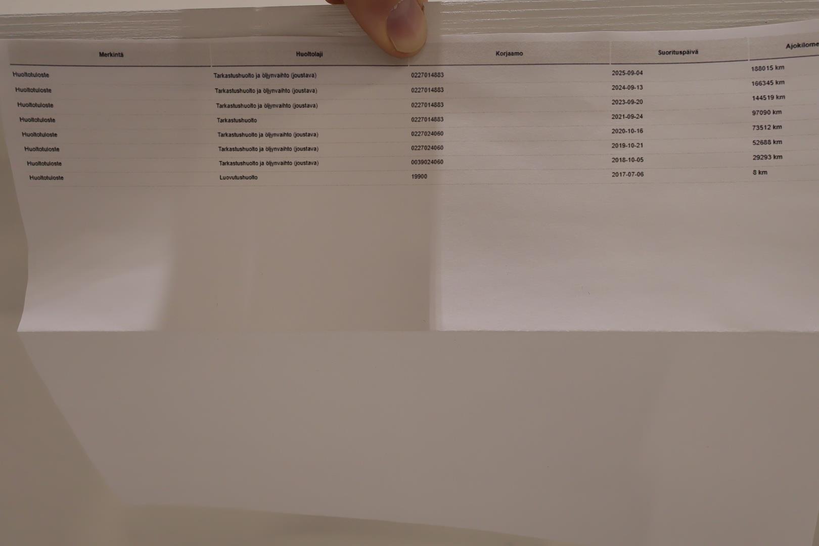| Huoltotulosteita ja ote sähköisestä huoltokirjasta |